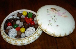 My paternal grandparents came from Greece and learned to make candy. Hand dipped chocolates and ribbon candy were part of my life. I could watch my grandmother work the chocolate with her fingers until the chocolate was the right consistency and then roll nuts or raisins, finishing each candy with a special chocolate swirl.