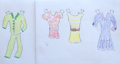 During our last visit, Juliet asked my mother to design some clothes for her hand-drawn paper doll. My mother sketched four outfits then bought a box of crayons to color them. Each ensemble had little tabs to hold the clothes in place. When they saw each other again, my mom showed Juliet her sketches and she was thrilled. She grabbed a pair of scissors and started cutting them out. Then the two fashionistas took turns modeling the outfits on the little paper doll.
